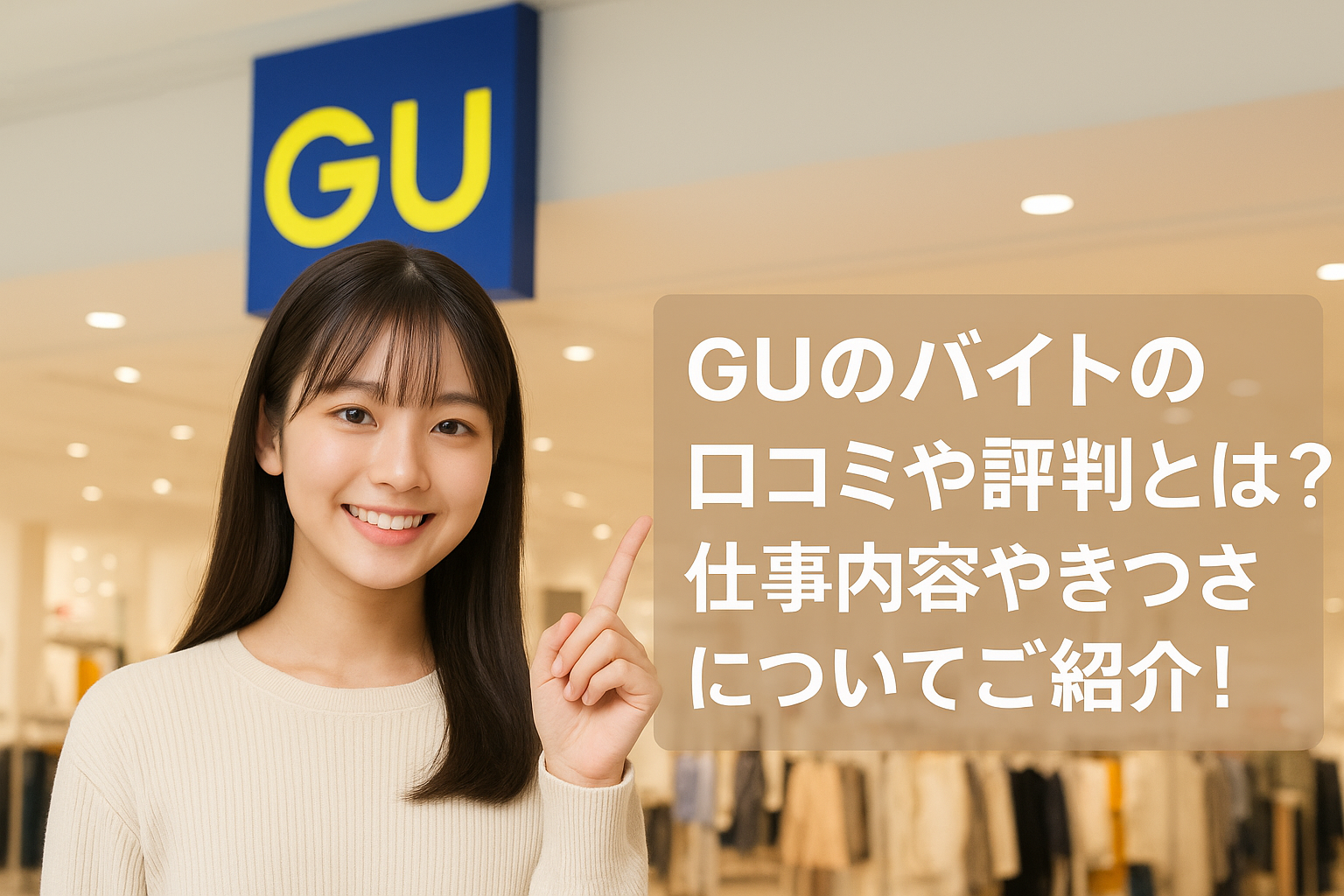 また、E-E-A-T(経験・専門性・権威性・信頼性)を意識し、実際の口コミ傾向を踏まえつつ、これからアルバイトを始めたい人が“具体的に働く姿を想像できる”ように構成しています。GUは全国に店舗があり、高校生・大学生・主婦パート・フリーターまで幅広い層が働く人気のアパレルバイトです。この記事を読むことで、GUのバイトがあなたに合っているか判断しやすくなるはずです!